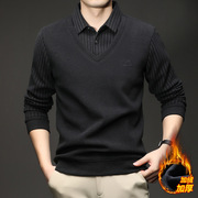 中年爸爸冬装加绒加厚保暖毛衣中老年人男士假两件上衣服针织毛衫
