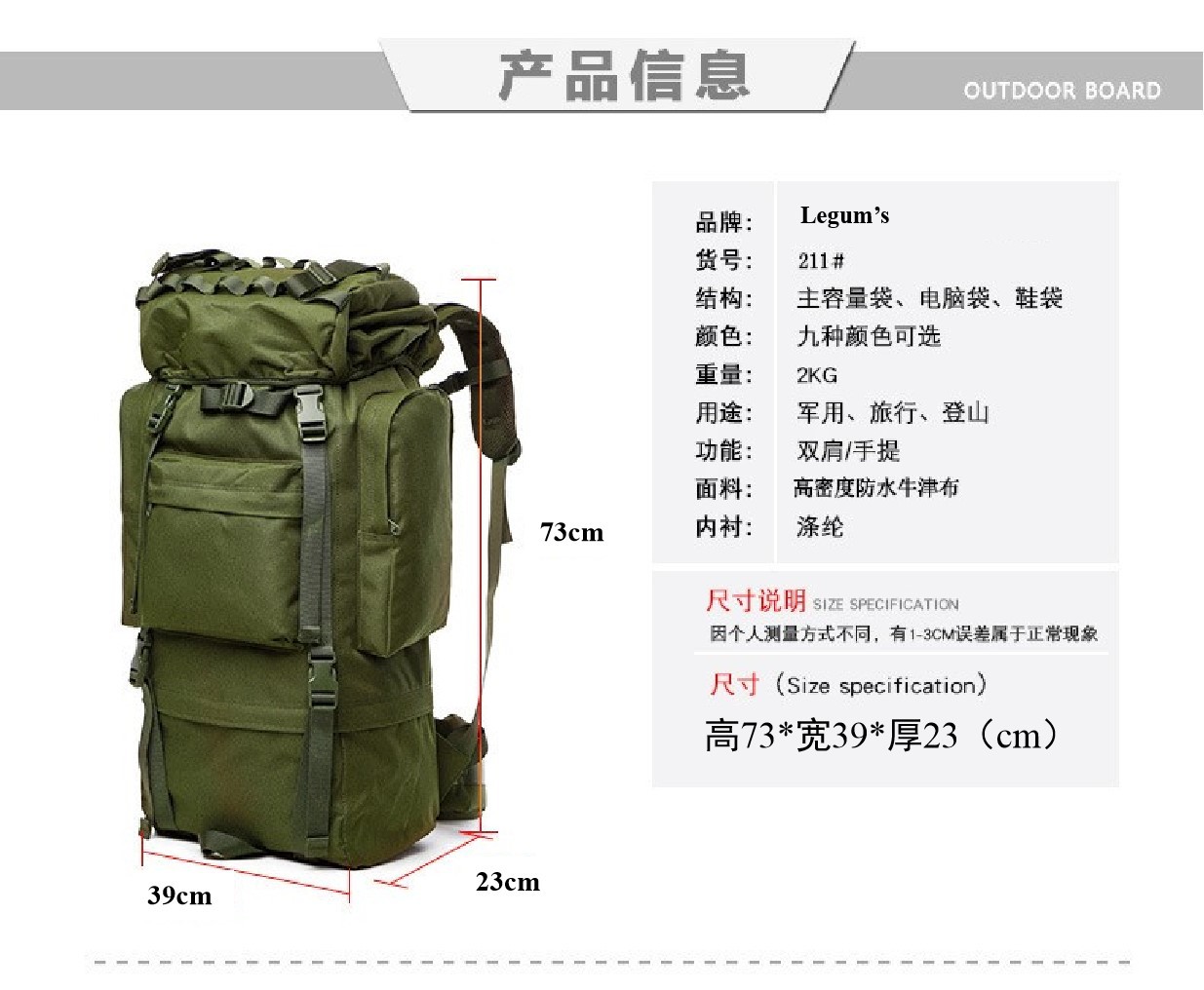 110L大容量登山包U型支架背囊战术双肩背包户外休闲旅行 徒步背囊
