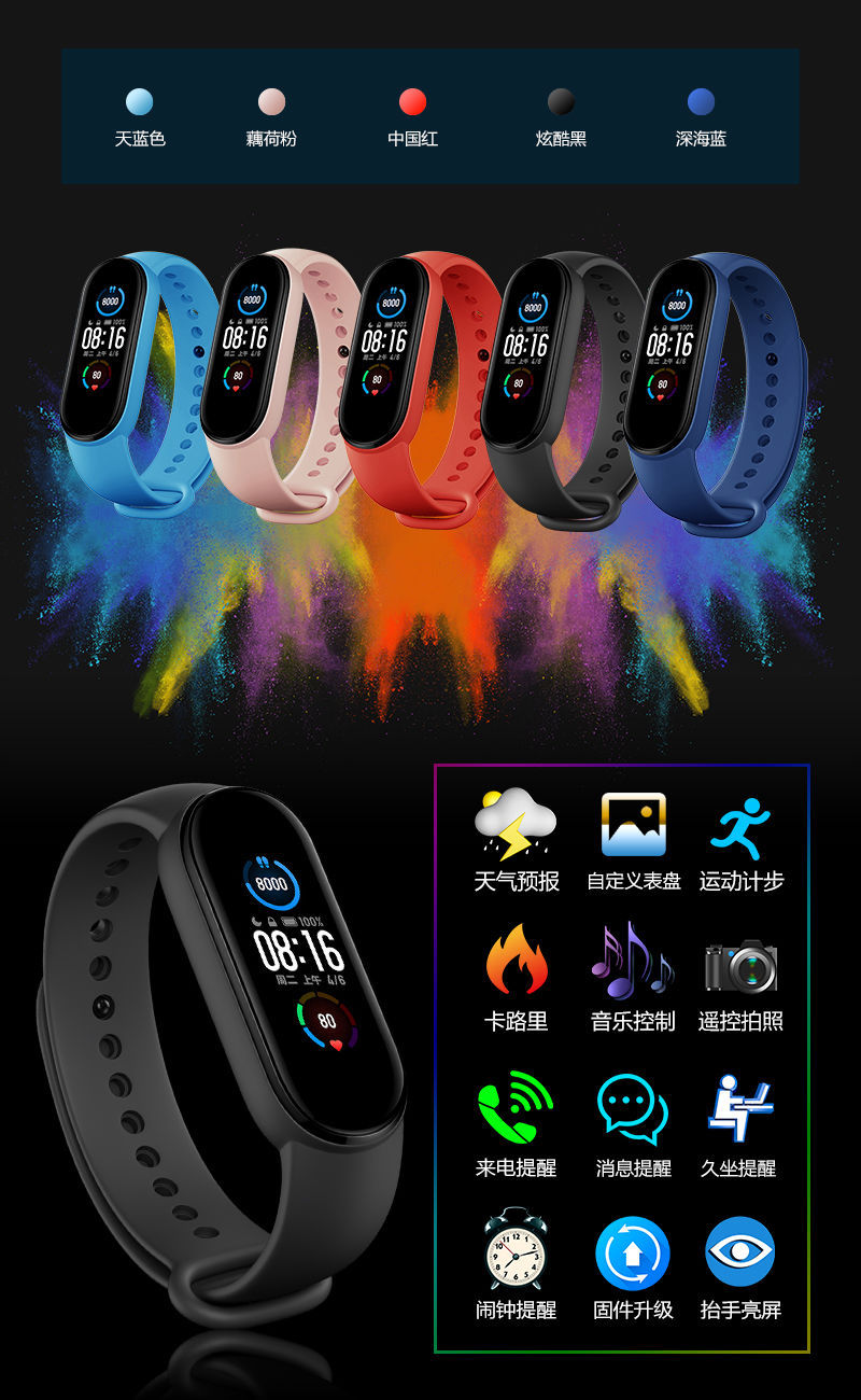 爆款热销M5智能手环男测血压心率彩屏蓝牙计步器运动手环手表女