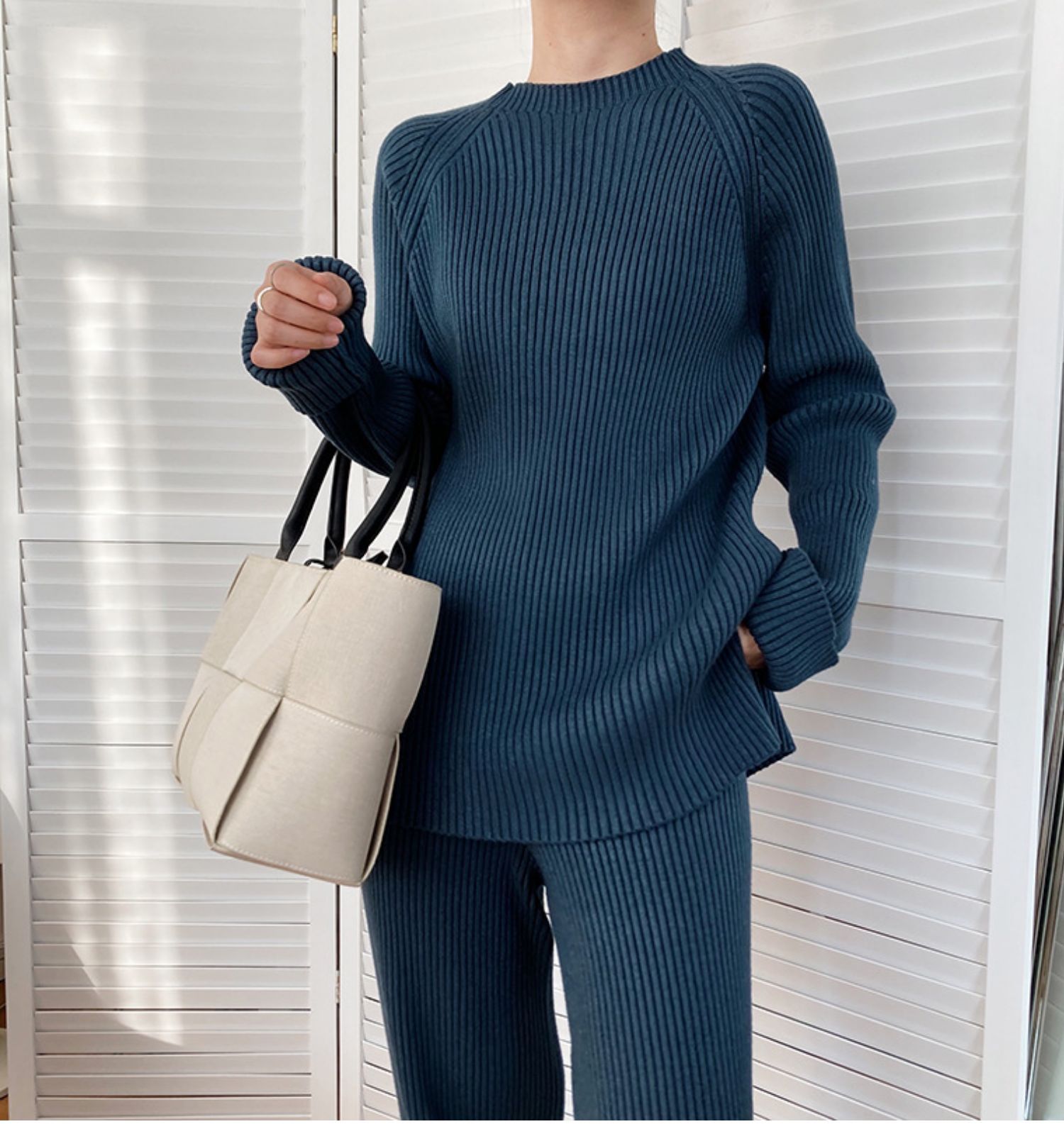 简约复古针织套装女秋冬新款时尚开叉毛衣阔腿裤宽松休闲两件套女
