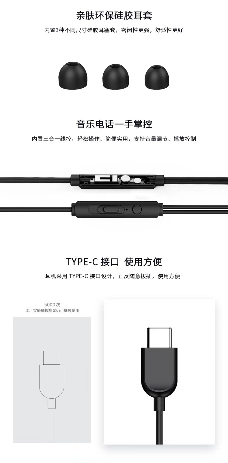 云仕HM9C耳机 type-c插口带麦有线耳机 入耳式高音质降噪游戏耳机