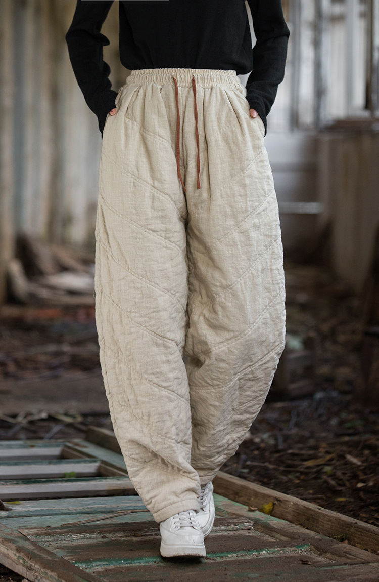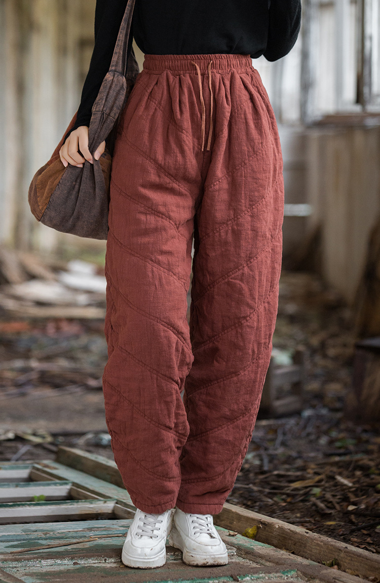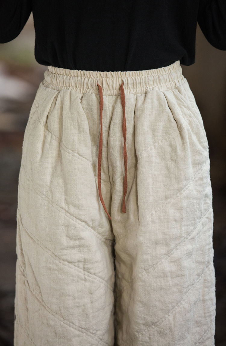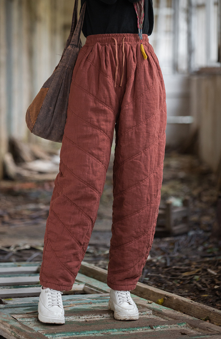 24冬季女装新款苎麻夹棉绗缝炒色裤子文艺百搭松紧腰女式长裤棉裤