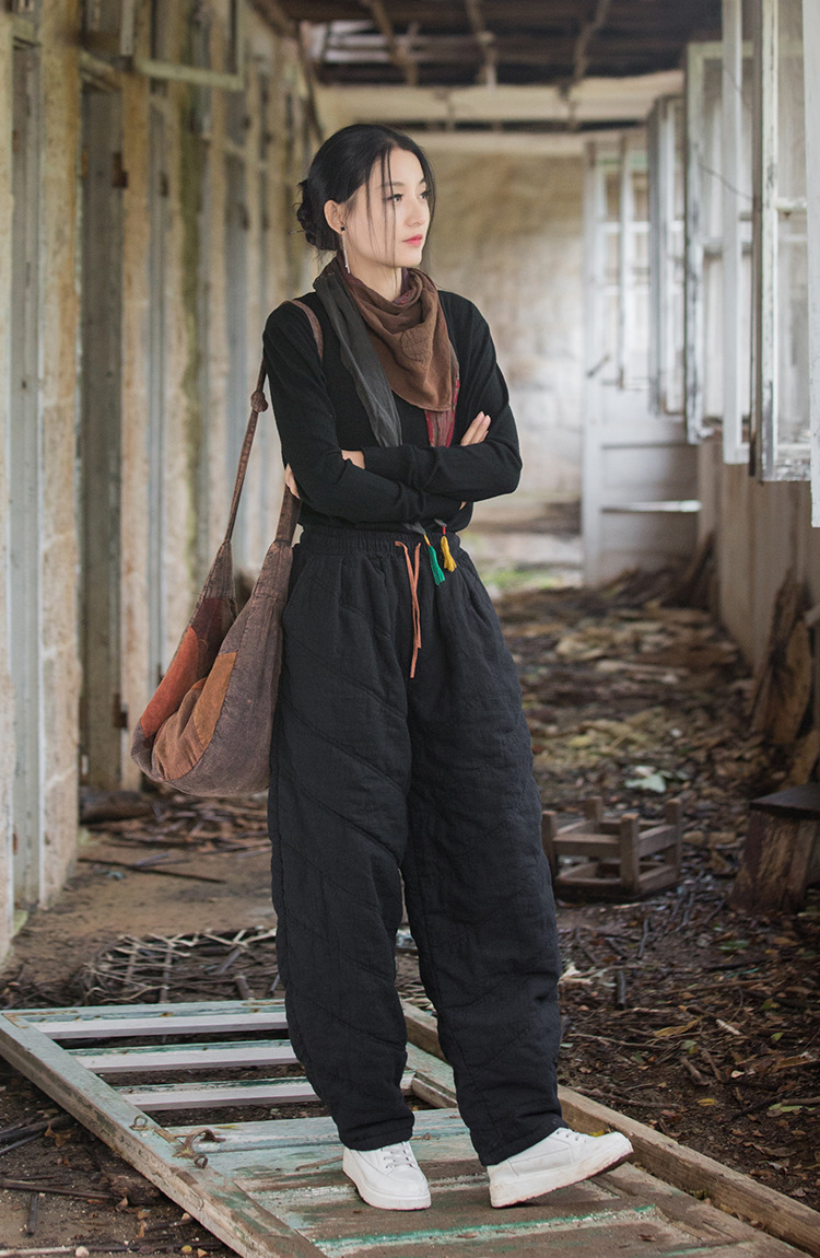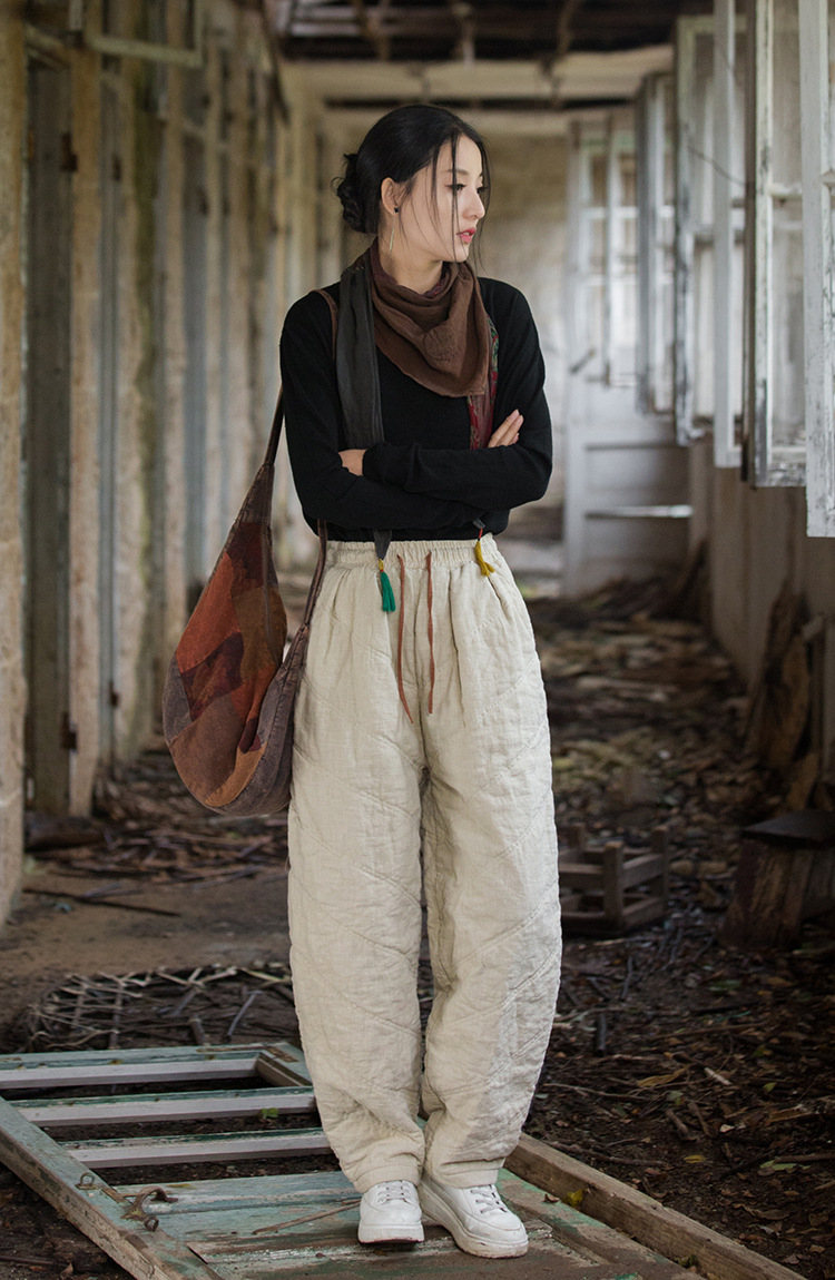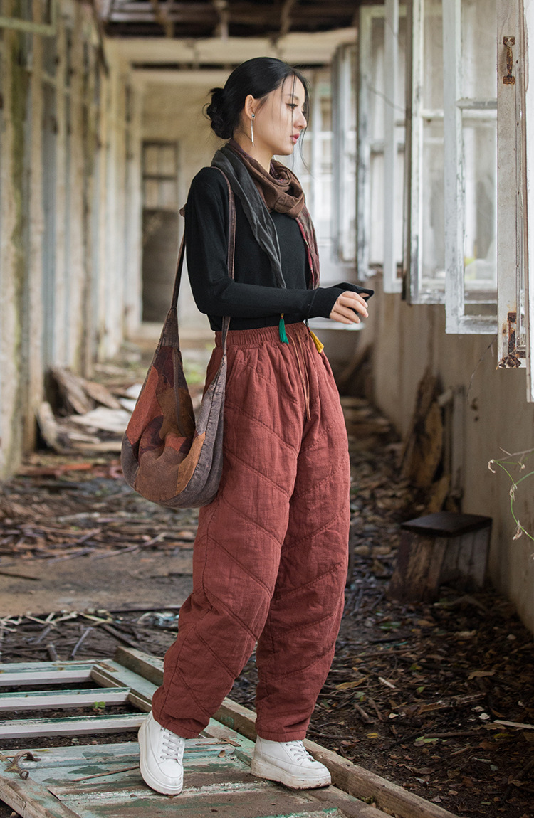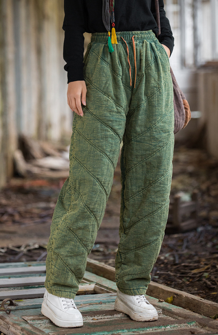 24冬季女装新款苎麻夹棉绗缝炒色裤子文艺百搭松紧腰女式长裤棉裤