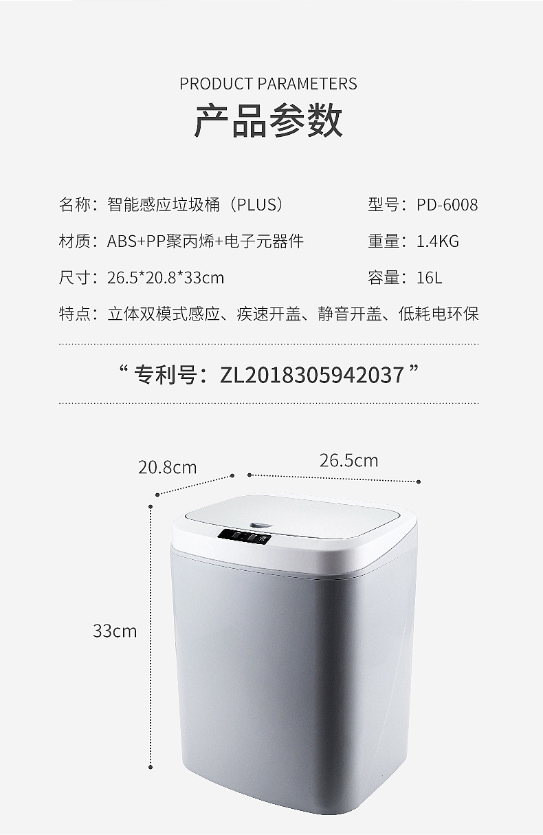 灰色16L 电池版(红外+按键+敲碰踢桶感应+夜灯)顶配型