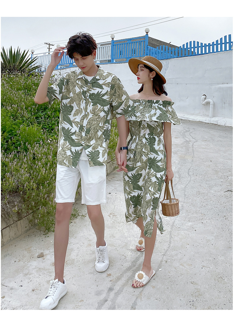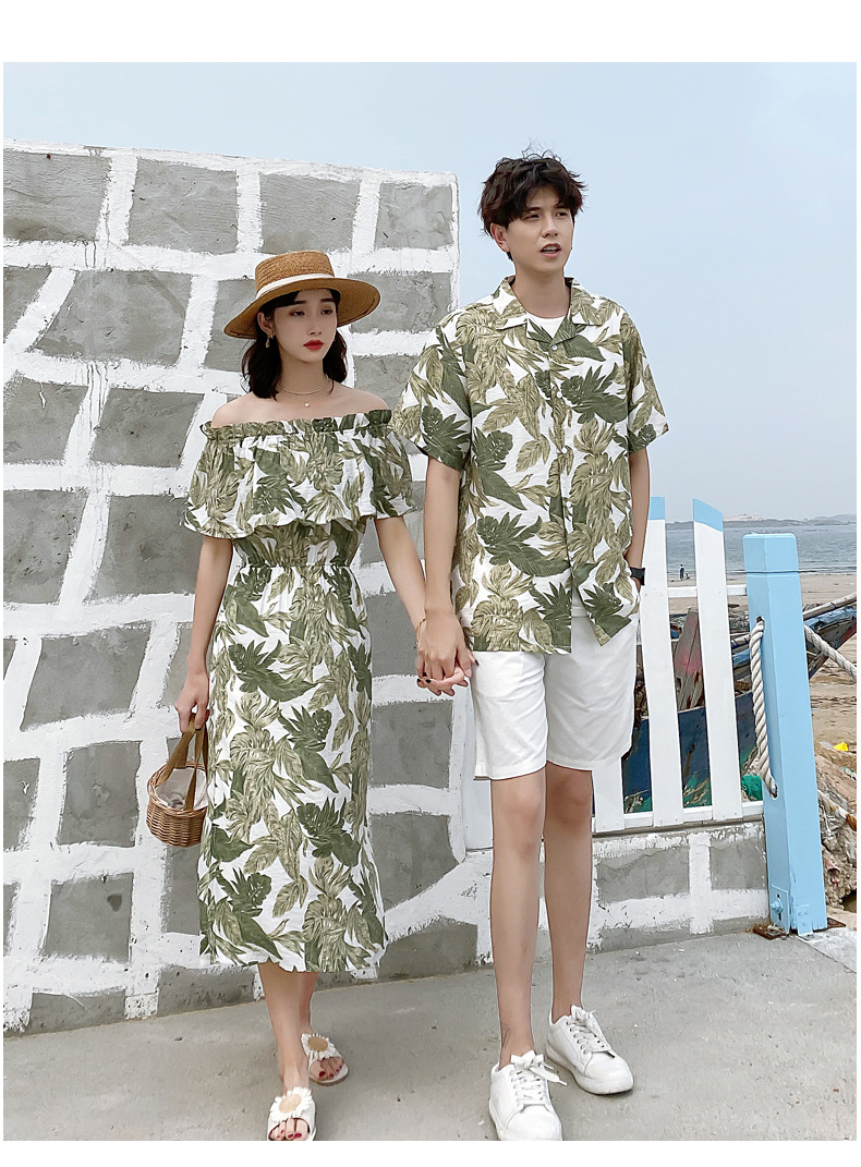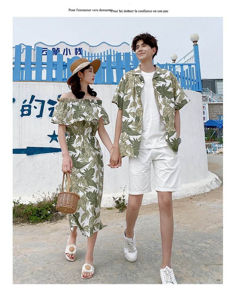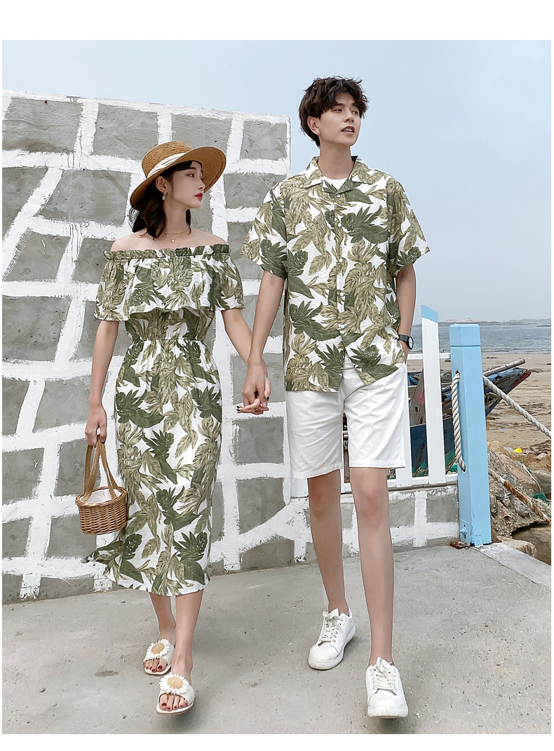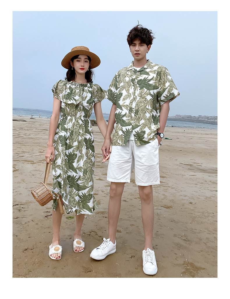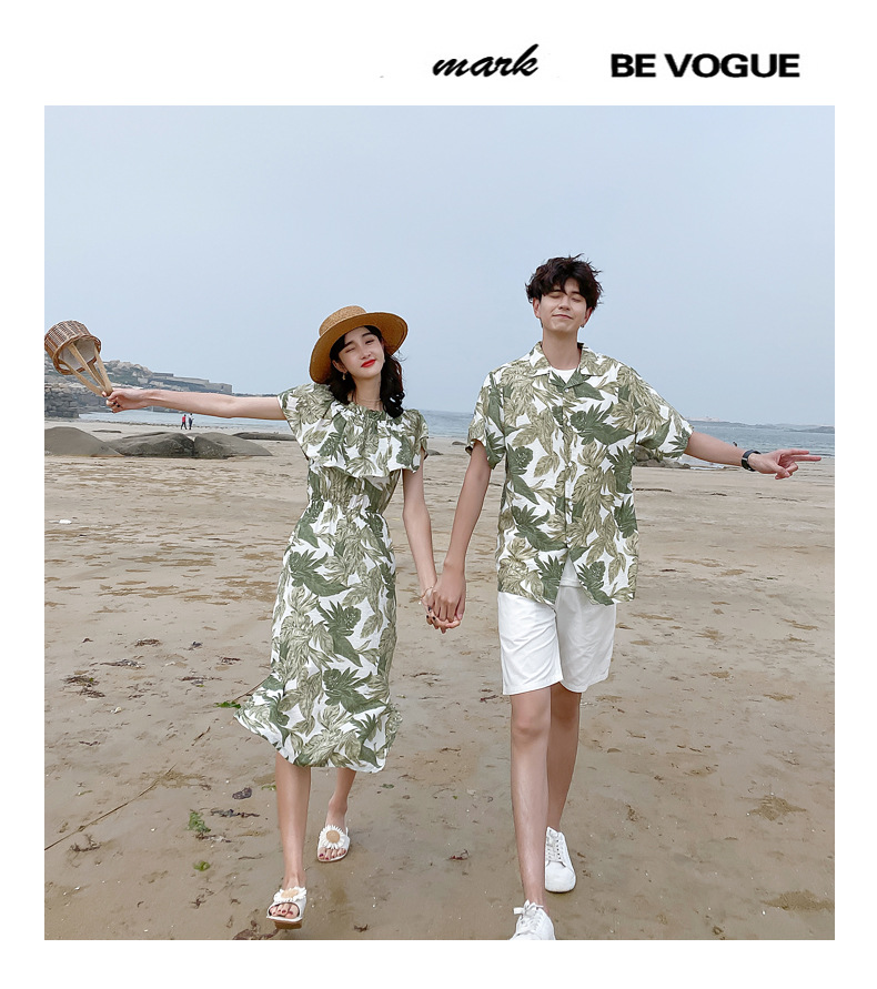 2024夏季情侣装沙滩裙修身气质连衣裙男花衬衫短袖