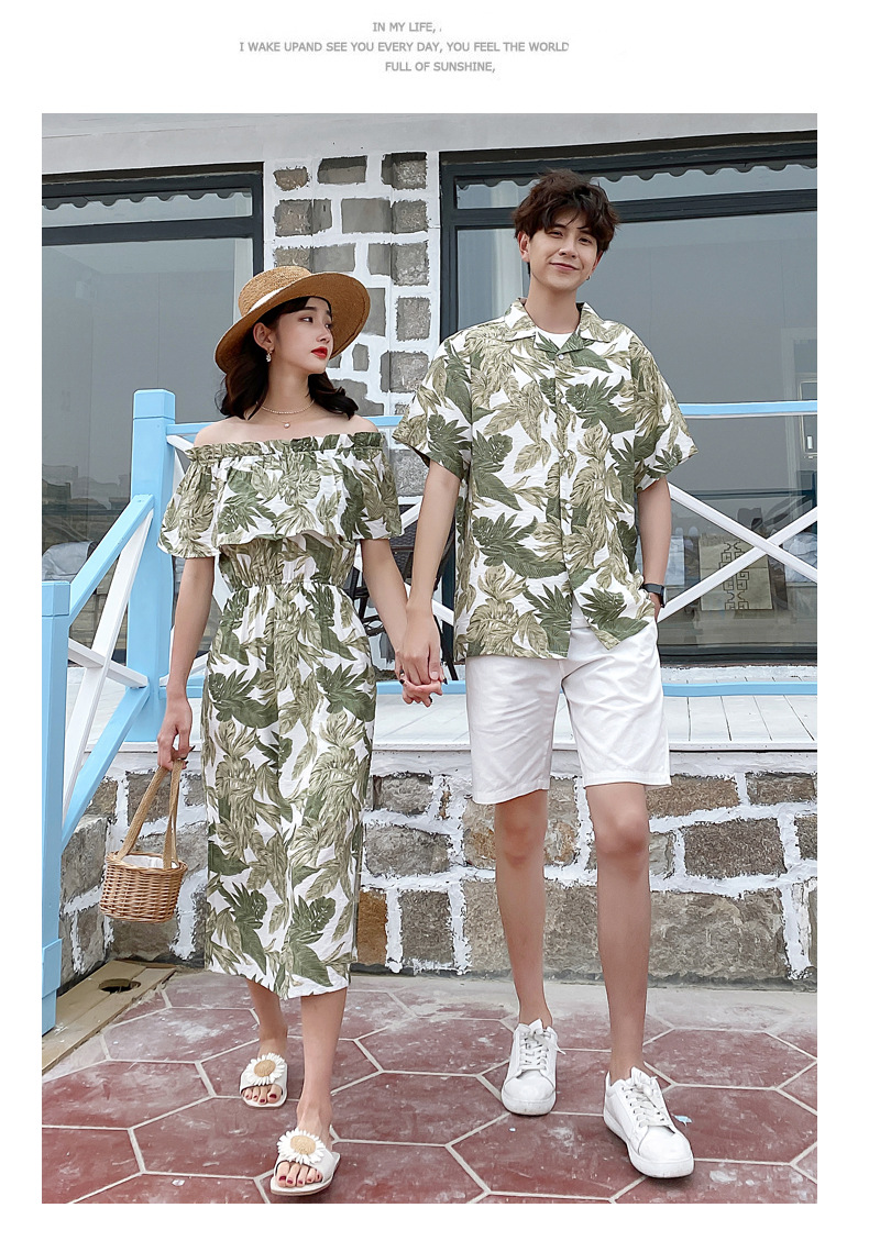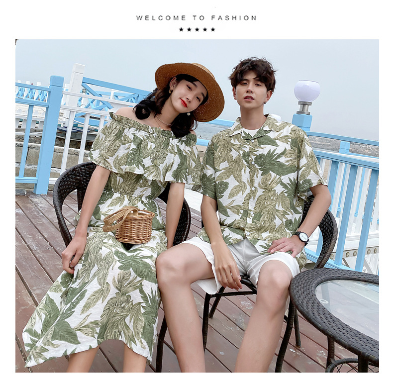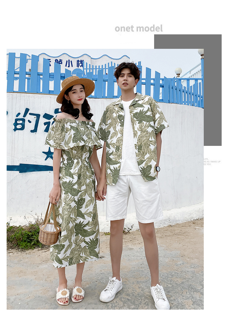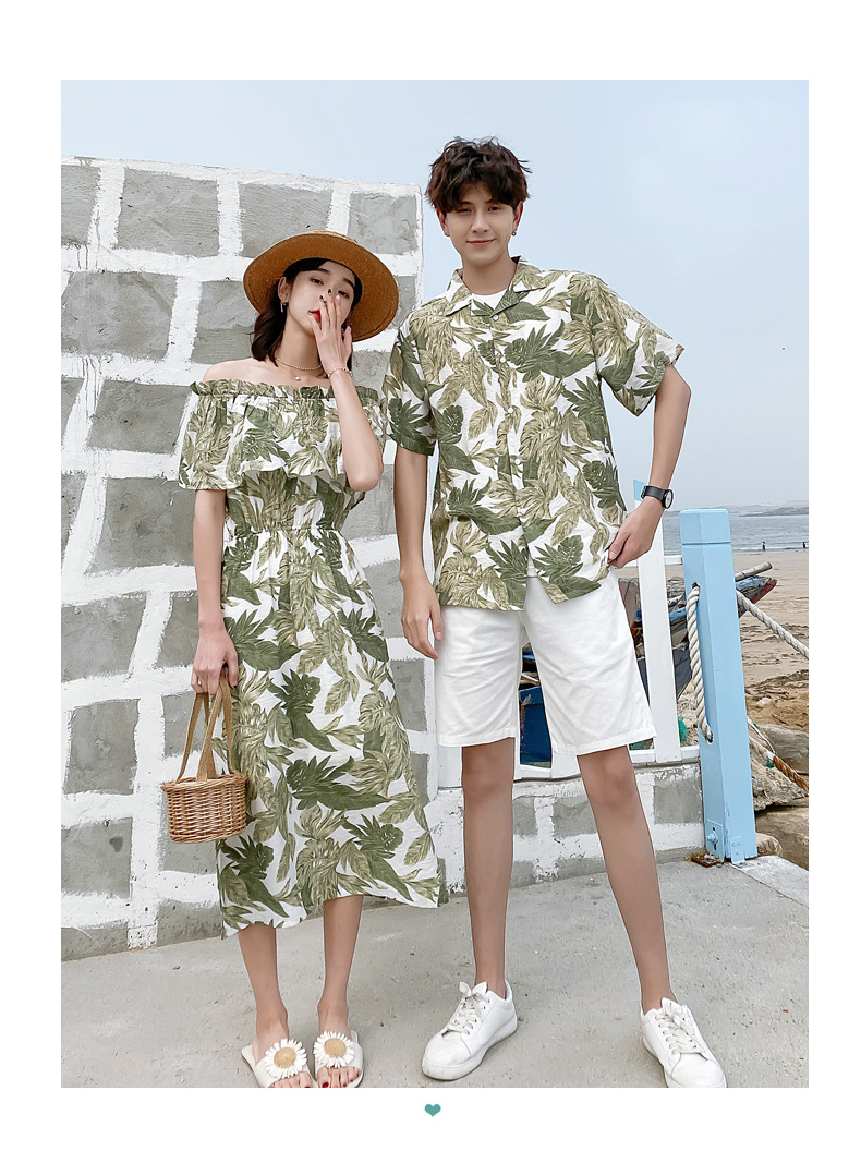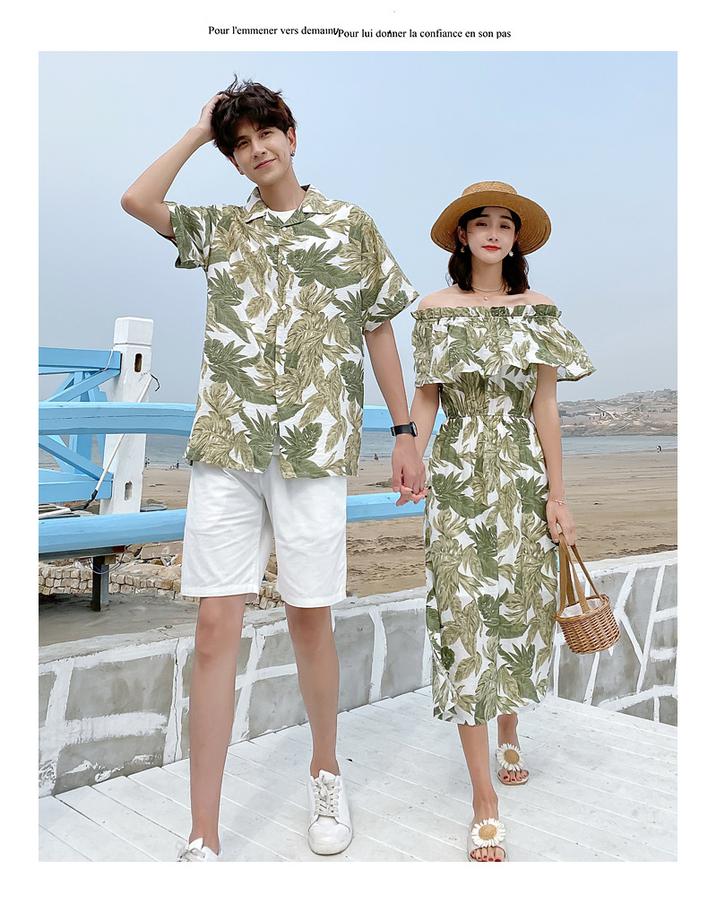 2024夏季情侣装沙滩裙修身气质连衣裙男花衬衫短袖